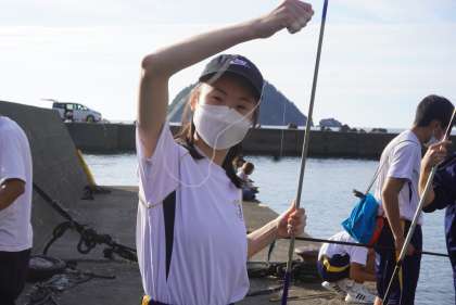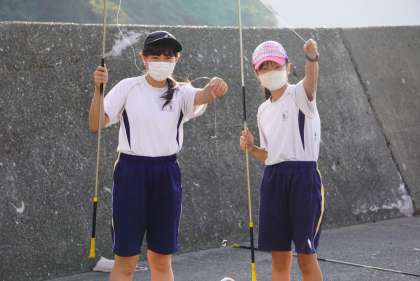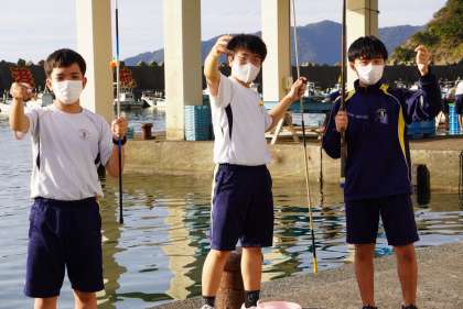 4組の釣り体験の様子です。初めての釣りに苦戦している生徒もいました。