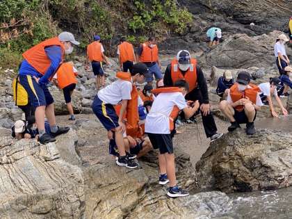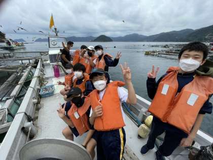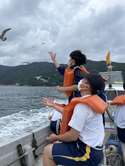 島に上陸して磯観察を行ったり、餌やり体験を行なっています。カモメと戯れて楽しむ生徒はいます。