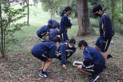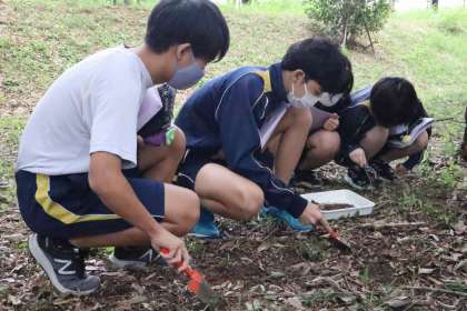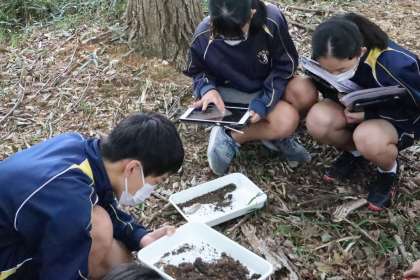 6日(木)1時間目に、3年生の理科の授業で屋外に出て土の中の生物の観察を行いました。学校の敷地のすぐ横の林で行いましたが、生徒の皆さんはこうした場所で生き物に触れる機会が少ないためか、恐る恐る土や朽ちた木を掘り返し、虫などが現れると大騒ぎしていました。観察自体も頑張っていましたが、自然に触れる機会も大切に感じてもらえるとうれしいです。