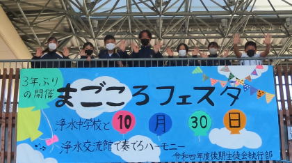 24日(月)に、後期生徒会執行部の生徒の皆さんがデザインから考えて準備をしてきたまごころフェスタの横断幕がようやく完成し、渡り廊下のところに設置して披露されました。学校や交流館に訪れる人々の目を引く爽やかな図柄に、いよいよだなという雰囲気を高めてくれます。お近くにお越しの際や当日には横断幕も是非直接ご覧ください。