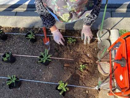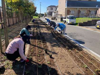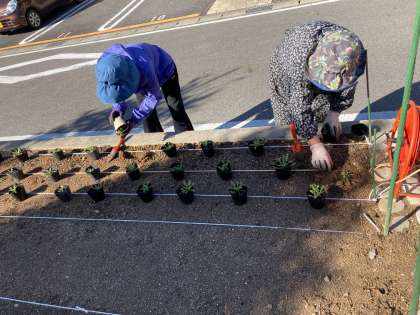 14日(月)午前、JVG活動として、地域のボランティアの皆様が学校敷地西にある50m花壇にネモフィラという植物の苗を植えてくださいました。ネモフィラは背が低く、横に広がって小さな花をたくさんつけて花のじゅうたんのようになる植物です。寒さにも強い性質あるそうで、これからきれいに花壇を彩るのが楽しみです。