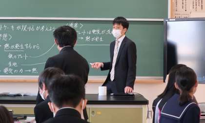8日(木)1時間目に、2年4組で理科の授業研究が行われました。今日は電気の力でホットケーキが焼ける理由を、実験を通して考えるという内容でした。普段、家庭でホットケーキを作ることを想像しながら、今日は理科室で作ることで半信半疑、実験に取り組んでいました。次第に湯気が立ち上がり、ホットケーキの焼きあがるにおいがしてくると、生徒の皆さんの関心もさらに高まってきました。実験後は、生徒なりに理由を考えてしっかりと発表する姿が見られました。
