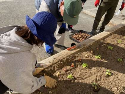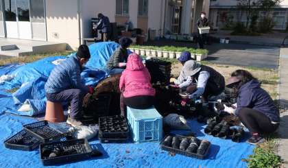 12日(月)午前に、年内最後のJVG活動が行われ、地域ボランティアの皆さんがお集りくださり、作業を行ってくださいました。少し冷たい風が吹く中でしたが、皆さん元気に作業に取り組んでくださっていました。今日は、ポット等の片づけや掲揚台付近の花壇の苗植えに取り組んでくださり、中庭や花壇がきれいに整備されました。また、昨年度に引き続き、教室に置く鉢植えの準備もしていただき、今後、生徒が作業をしていく予定です。学校施設の内外が花いっぱいになるのを楽しみにしたいと思います。
