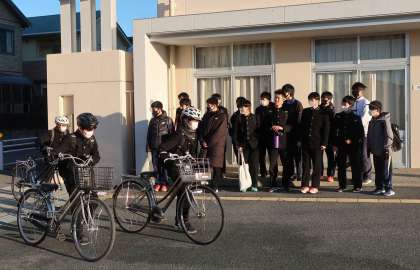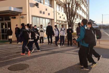 前日に引き続き23日(金)も生徒会主催の朝のあいさつ運動が行われました。本日も生徒会執行部の生徒や有志の生徒が昇降口や正門に立って登校する生徒の皆さんに元気なあいさつを届けていました。晴れていたものの、風もあってものすごく寒い中でしたが、みんなで元気にあいさつを交わしていました。この活動は年始も行う予定です。年明けから元気に登校できるとよいと思います。