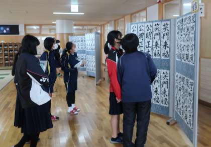 10日(火)に行われた書初め大会で市選抜作品展に出品される生徒の作品を昇降口に展示しました。休み時間や登下校時に、展示場所には生徒が多く集まり、作品を眺めて感想を言い合うなどしていました。どの作品もそれぞれ良さがあり、書いた生徒の頑張りが伝わってきます。