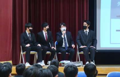 2日(木)午前、3年生の企画で「校長先生に感謝する会」が行われました。校長先生にはレクリエーションのお誘いをしただけで、サプライズで行いました。インタビューを通して校長先生の意外な一面を知り、親近感をもった生徒が多かったようです。また、代表生徒や学年の先生方も一緒にクイズ等を楽しみ、最後はプレゼント映像と学年全員での記念撮影を行いました。3年生の温かい企画が校長先生への最高のプレゼントになりました。