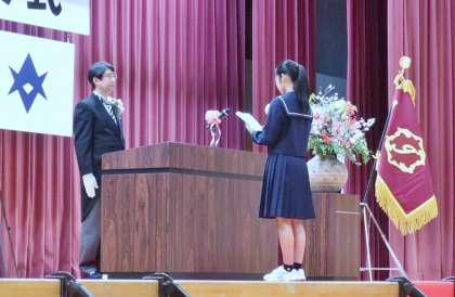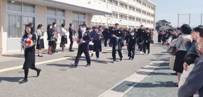 7日(火)朝から爽やかな晴天の下、第7回卒業式が行われました。3年ぶりに豊田市長太田稔彦様を始め7名の来賓の方をお招きし、保護者の皆様、教職員が見守る中、卒業生が堂々と式に参加しました。式後は各学級で最後の時間を過ごし、最後は保護者にも見送られながら門出送りを行い、220名の卒業生が無事に巣立っていきました。義務教育を終え、それぞれ選んだ道を進んでいく皆さんに幸多いことを祈ります。