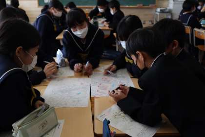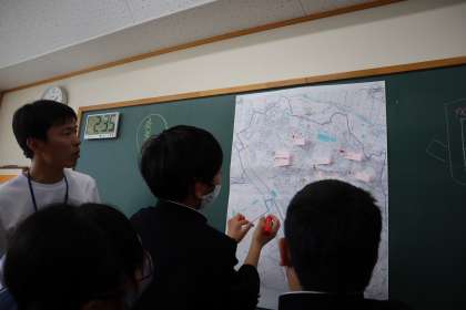本日,1年生は,先週末に実際の通学路で下調べしてきた交通ルールや危険な場所についての情報共有をしました。皆,真剣に地図に書き加えて,安全に自転車で登下校できるように話合いをしていました。