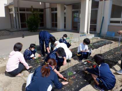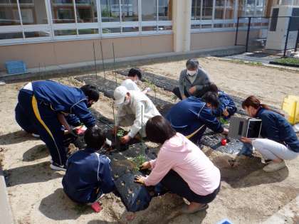 11日(水)まごころ学級の生徒たちが、ピーマンやナス、ミニトマトなどの野菜の苗を植えました。畑に移植ごてで穴を掘り、苗を入れてやさしく土をかけました。きっと大きくおいしく育ってくれるでしょう。今から収穫が楽しみですね。これからのお世話もがんばってください!