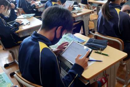 12日(金)、1年生の社会科の授業では、地理の学習の基本となる地図の見方を学んでいました。教師が出題する経度を素早く計算する等を行っていました。自由自在に地図を読み取れる力が付くとよいですね。2年生の家庭科の授業では、安全な食事について学習をし、タブレットで自分たちの疑問を調べていました。3年生の理科の授業では、物体の運動を調べる実験のデータ処理を行っていました。細かな作業で、苦戦しながらも一生懸命に取り組んでいました。