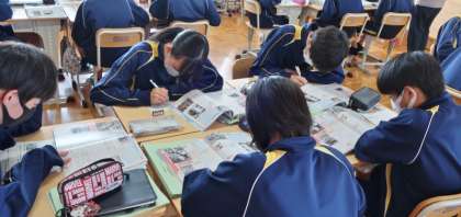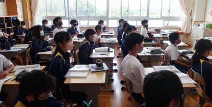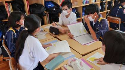 22日(月)、1年生の数学の授業では、指数の学習でデジタル教科書が提示する問題をクラス全員で楽しく答え合っていました。2年生の総合的な学習の授業では、まごころフェスタに向け、現時点の疑問をどのように聞いたらいいかをみんなで考えていました。3年生の社会科の授業では、第2次世界大戦後の日本について、各自で調べたり考えたりしたことを元に班で話し合っていました。