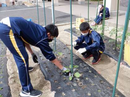 25日(木)、サツマイモの苗植えをしました。畝に斜め下に穴を開けて、苗を大切に入れ、土をやさしくかぶせました。そのあとじょうろで水をやり、周りの雑草を一生懸命に抜いて完了です。今後は苗への水やりは少なくてよいとのこと。今から、秋の収穫が楽しみです。