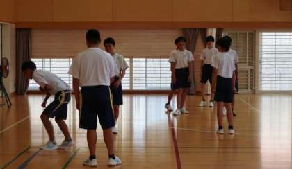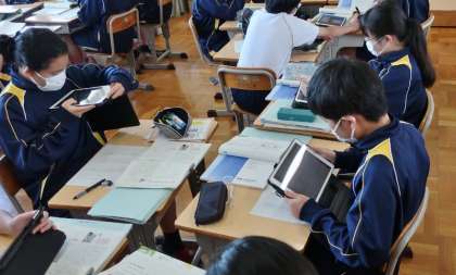 13日(火)、1年生の理科の授業では、動物の分類の学習として各自で調べた動物の特徴等を学習用タブレットのプレゼンテーションソフトでまとめ、互いに発表していました。みんな興味深げに画面を見入っていました。2年生の国語の授業では、説明文の読み取りを行い、各自の考えをまとめたワークシートを学習用タブレットで撮影して、先生に提出したり、話し合いでスクリーンに投影してみんなで共有したりしていました。3年生の体育の授業では、水龍祭でも取り組んだ長縄跳びの学習で、様々な跳び方に取り組んでいました。水龍祭であれだけリズミカルに跳んでいた生徒の皆さんが苦戦していました。奥が深いですね。