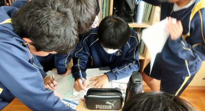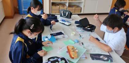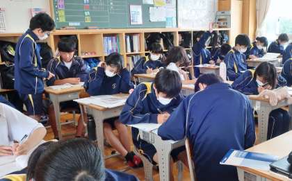 14日(水)、1年生の家庭科の授業では、手縫いの学習を行い、練習布でなみ縫いに取り組んでいました。慣れない手つきで、一刺しずつていねいに縫っていました。2年生の数学の授業では、連立方程式の学習で、加減法という方法で計算する練習をしていました。友達と答えを確認したり、先生に質問したりしながら一生懸命に取り組んでいました。3年生の英語の授業では、英作文の学習で、先生から示された穴埋め問題について、仲間と括弧内にどんな英単語が入るのか真剣に議論しながら完成を目指していました。