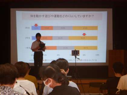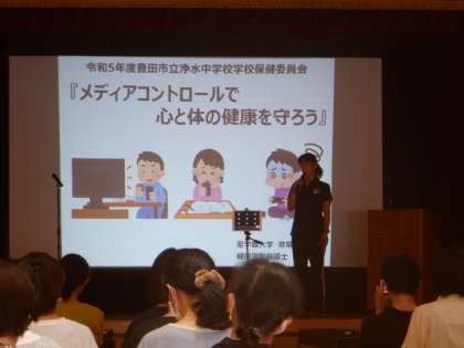 14日(木)学校保健委員会がありました。保健委員会の皆さんからアンケートの結果について発表がありました。また、至学館大学の池野先生から「メディアコントロールで心と体の健康を守ろう」についてご講演をいただきました。