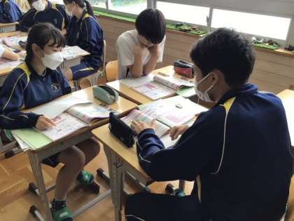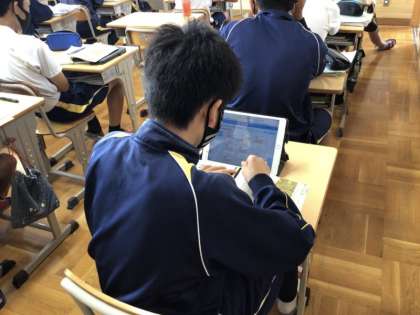 20日(水)、1年生の数学の授業では、問題演習を終えたところで、気分転換しながら楽しく盛り上がっていました。先生の質問にみんなが笑顔で手を挙げていて、思わずシャッターを切りました。2年生の国語の授業では、物語文の学習で、登場人物の気持ちを読み取り、ワークシートにまとめたものをタブレットでクラス全体で共有していました。クラスの仲間の意見をじっくりと見比べている様子が見られ、自分の考えを深めているようでした。3年生の社会科の授業では、選挙について学習していました。教科書の資料を元に、どの考えの候補者を選ぶかをグループで話し合っていました。どのグループも熱く語り合っていて、こうした話し合いを経験することも大切な学びになっていました。