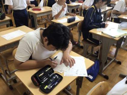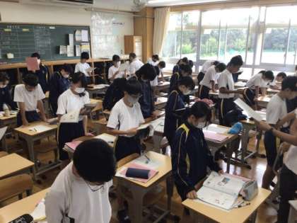 21日(木)、1年生の英語の授業では、英語によるスピーチの学習を行い、教科書の本文を例に、実際に大きな声を出したり、A LTの先生に発音を教えてもらいながらスムーズにできるように繰り返し練習に取り組んでいました。2年生の国語の授業では、問題演習を終えた後に、先生の解説を聞いたり、模範解答と見比べたりしながら、どの子も一生懸命に見直しをしていました。間違えたところこそ貴重な成長のチャンスですので頑張ってほしいと思いました。3年生の体育の授業では、球技の学習としてドッヂボールを行っていました。ボールを複数入れるなど、難易度を上げて取り組むことで、運動量を高めて活動に取り組んでいました。