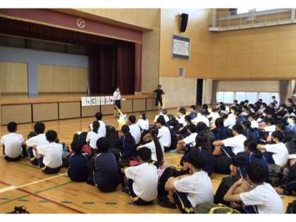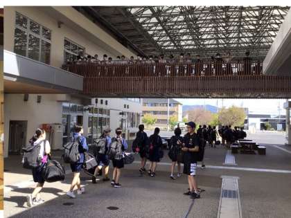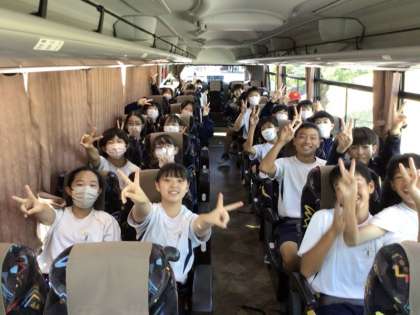 2年生の自然教室が始まりました。体育館で出発式を行い、1、3年生の皆さんの温かい見送りを受けながら、予定通り元気に出発しました。天気にも恵まれ良いスタートとなりました。