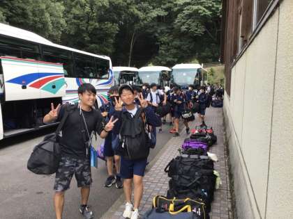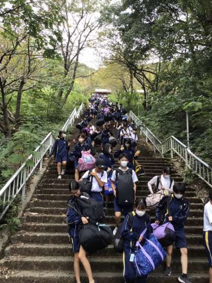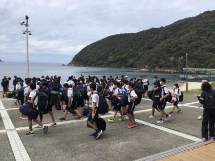 無事に自然の家に到着しました。名物の大階段に驚きながらみんな一所懸命に降りて、目の前に広がる海に思わず声を上げていました。