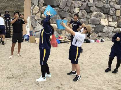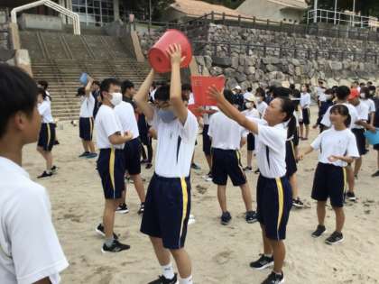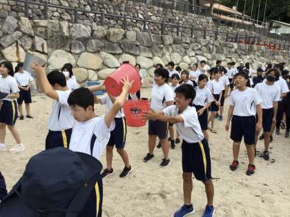 2種目目はバケツリレーです。クラスの仲間でバケツの海水をリレーで次々に渡していきます。