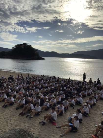 閉会式では結果発表が行われ、入賞したクラスをみんなで讃えました。また、実行委員会担当の先生から実行委員の生徒の頑張りが紹介され、みんなで感謝の拍手をしました。楽しい時間を過ごせたのは実行委員の皆さんの努力のおかげです。最後の夕日の海をバックに学年全員で記念撮影をしました。