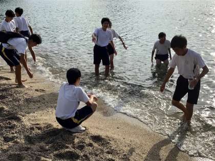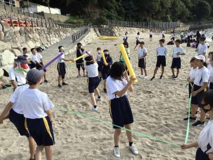 砂浜運動会の後、学級別のレクを行いました。ドッヂボールやスポーツチャンバラ、波打ち際で波と戯れるなど、それぞれ学級の親睦を深めていました。