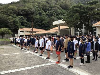 集いのひろばで朝のつどいを行いました。穏やかな海を見ながら爽やかな気持ちで参加しました。まだ眠そうにしている人もいますが、みんな元気に今日の活動に取り組めそうです。