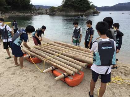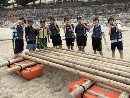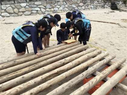 いかだを自分たちで組み立てています。丸太などの資材を運ぶのも一苦労です。