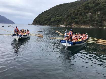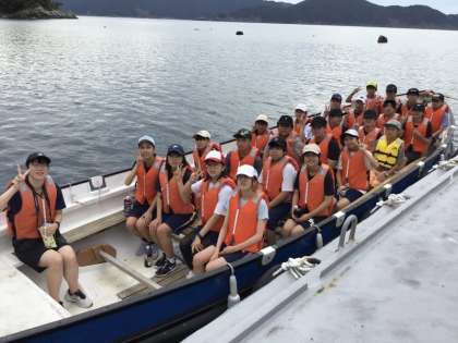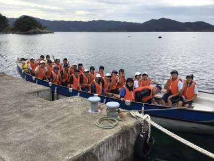 指導教官の指示のもと息を合わせて順調に漕ぎ出して、沖の方までカッターを進めています。声が小さかったり、櫂のリズムが合わなかった艇も徐々に慣れてきていいペースで進んでいるようです。