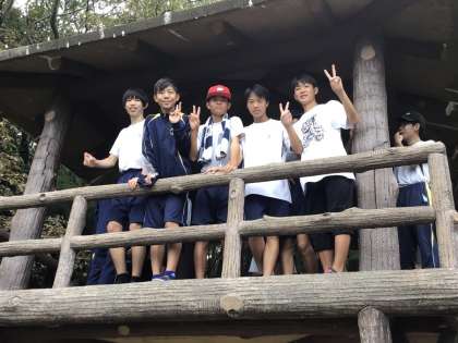 目標の歌碑のところに到着しました。展望台で学級の集合写真を撮りました。