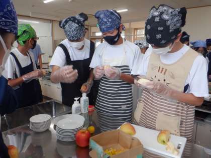 まごころフェスタで洋菓子を販売するクラスでは、お菓子の試作を作っていました。実際に数種類の果物をカッティングしたり、クリームを混ぜたりしながら、お菓子作りに挑戦です。