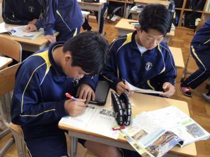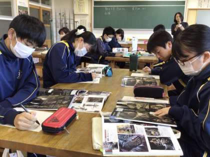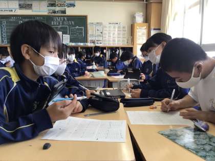6日(金)、1年生の数学の授業では、比例や反比例の学習を行っていました。グループの仲間どうしで問題を出し合い、出題されたものをグラフに表していました。互いに確認したり、多様な問題を出し合ったりしていました。2年生の社会の授業では、東北地方の伝統や産業の特色について学習していました。一人で教科書等を活用して調べたり、複数の仲間と相談したりして課題に取り組んでいました。3年生の美術の授業では、鑑賞の学習を行っていました。今回は、日本の歴史的価値のある仏像について資料集等の画像を見比べ、自分なりの気づきをまとめていました。