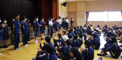 前期最後の学年集会を行いました。入学してからこれまで半年間のがんばりや,後期に向けての心構え等の話を聞きました。また,前期のリーダーの退任のあいさつを聞いて感謝の気持ちを込めた拍手を,後期のリーダーへは激励の拍手を送っていました。