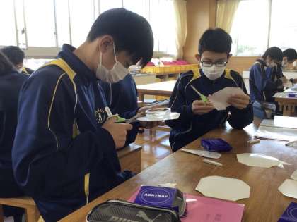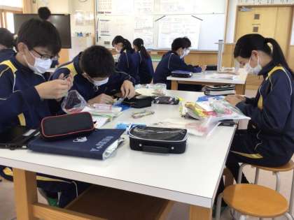 10日(火)、1年生の理科の授業では水溶液の学習を行っていました。水溶液の性質を理解するために先生が身近な例を紹介すると、驚きとともに目を輝かせて納得していました。2年生の美術の授業では、ガラス容器への装飾の学習を行っていました。ガラス容器へのマスキングにみんな慎重に集中して取り組んでいました。3年生の家庭科の授業では、衣服の補修について学習していました。スナップ付けなどを練習していましたので、これからは自分でもボタン付けなどの補修ができるとよいと思いました。