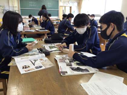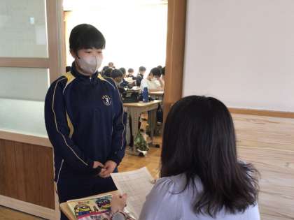 11日(水)、1年生の国語の授業では、古典の学習として、竹取物語の冒頭部分の暗唱テストを行っていました。緊張した面持ちで先生の前で一生懸命に発表していました。繰り返し声に出すことで古文の響きを実感できると思います。2年生の体育の授業では、ハンドボールの学習として、実戦にチャレンジしていました。男女に分かれてゲームを行い、男子はシュートも様になっていてとても見応えのある様子で、応援する生徒も大変盛り上がっていました。3年生の美術の授業では、木彫の学習を行っていました。自分の願いを形にするという課題が出され、グループの仲間とどんな作品にしようかと話し合っている様子が見られました。