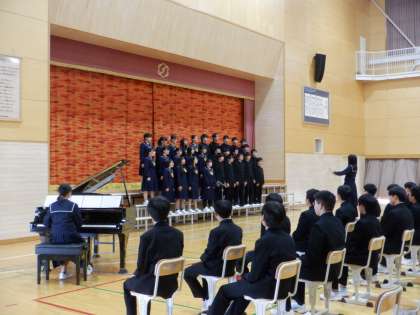 19日(木)午後、3年生のプレ合唱コンが行われ、各学級がこれまで練習してきた途中経過を発表し合いました。緊張感に包まれた体育館で、学級ごとに発表していき、お互いの歌声や姿から刺激を受けたことと思います。