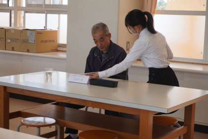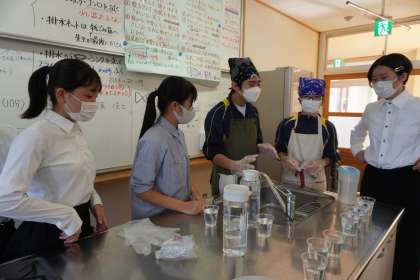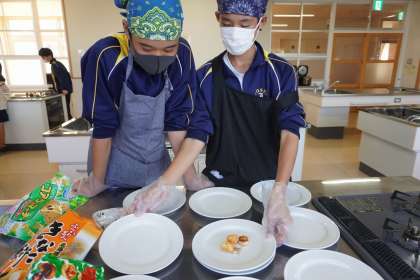 10月23日(月)まごころフェスタ本番に向け、2年生のあるクラスでは、教職員をお客さんにみたて、接客の練習を行いました。盛り付け担当が、美しさやおいしそうな見え方にこだわって盛り付け、接客担当が、丁寧に料理を運んだり笑顔で料理の説明をしたりするなど実践しました。