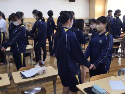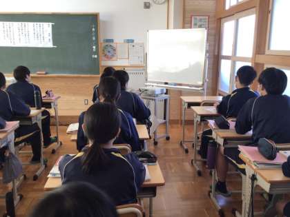 31日(火)、1年生の技術の授業では、木工の学習でハンドラック制作を行っていました。のこぎりやキリ、紙やすり、電動器具を使って図面通りに作成していました。印に合わせて切ったり穴をかけたりと慣れない作業に苦戦しながらも先生や友達に相談しながら集中して取り組んでいました。2年生の音楽の授業では、合唱の学習を行っていました。ペアで向かい合い手をつないだ状態で歌を歌っていました。相手の表情や体から伝わる音の響きを感じながら練習に取り組んでいました。3年生の国語の授業では、詩の学習を行っていました。題材の島崎藤村「初恋」の時代背景について動画の解説を試聴して、詩が表現している世界を理解していました。