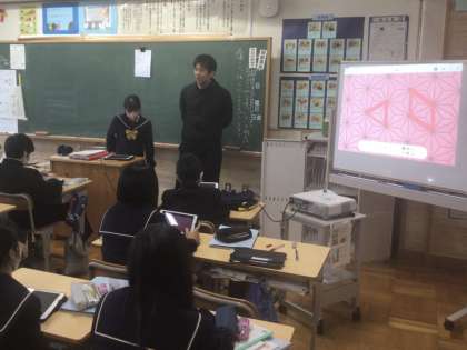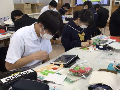 7日(火)、1年生の数学の授業では、図形の学習を行っていました。身近にある模様の中から各自がさまざまな形を見つけ出し、全体で発表し合っていました。それぞれに発見があり、お互いの発表を興味深く見ていました。2年生の社会の授業では、フランス革命後の政治について学習していました。先生から出された課題に対して、自分なりに調べたことを基に考えたことを先生に説明することで理解を深めていました。3年生の家庭の授業では、布絵本の制作に取り組んでいました。各自の図案に合わせて布を切ったり縫ったりして幼児が喜びそうな絵本ができあがりそうでした。