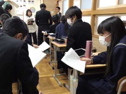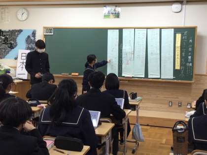 29日(水)午後、3年6組で国語の研究授業を行いました。和歌の学習で、班ごとに担当した和歌の現代風に表現した作品の発表を行い、その作品の鑑賞を行いました。それぞれが和歌をしっかりと解釈して新たな作品に仕上げていたことに驚かされました。古典を深く味わう貴重な機会になっていました。