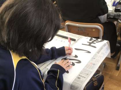 4日(月)、1年生の国語の授業では、書写の学習を行っていました。例年、ご協力いただいている書写ボランティアの方を講師にお招きして、初めて挑戦する行書の筆遣い等について丁寧に教えていただきました。お手本に教えていただいたことを赤ペンでメモをして書く上でのポイントとなることをしっかりと確認していました。これからの練習や本番で教えていただいたことを生かして書けるとよいと思います。