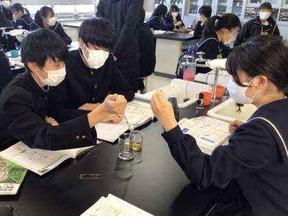 2年生の家庭の授業では、筑前煮を作る調理実習を行っていました。班で協力しみんなの力で完成していました。調理や盛り付けに細心の注意を払い、丁寧に作業している生徒ばかりでした。とても美味しそうな匂いが充満していました。3年生の理科の授業では、中和の実験を行っていました。酸性、アルカリ性の水溶液を混ぜ合わせて中性になるように調整していました。微量での調整が大切なため、上手にできたところは班の仲間で大喜びしていました。