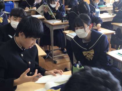 6日(水)、1年生の社会の授業では、南アメリカの学習を行っていました。ブラジルのサトウキビ生産量が増加している理由を資料を元に考え、隣同士で話し合っていました。根拠を元に考えを伝え合う機会を作っていました。2年生の英語の授業では、近日中に行われるスピーキングテストに向けた学習を行っていました。テストでは単に英語で答えるだけでなく、アイコンタクト等の受け応えの姿勢も評価の対象になるため、クラスの仲間と互いに練習などをしていました。また、タブレットを使って質問の英文を訳すなど上手に活用して対策している生徒もいました。3年生の理科の授業では、前時に行なった実力テストの復習を互いに教え合う学習を行っていました。学習診断テストや入試が近いため、教室のあちらこちらで熱心に教え合う様子が見られました。