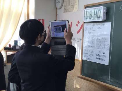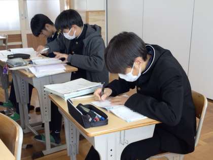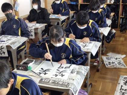 7日(木)、1年生の数学の授業では、立体図形の学習を行っていました。この学習の最初の授業ということで、身の回りの様々な立体図形を探そうと、学習用タブレットを持って教室や廊下で撮影していました。撮影した画像を見比べて何の形かと話し合っている姿も見られました。2年生の国語の授業では、書写の学習を行っていました。2年生の書き初めの課題は「笑門来福」です。お手本で書き方を確認し、実際に書いていました。緊張感のある雰囲気でみんなとても集中していました。3年生の数学の授業では、図形の学習を行っていました。今日はやや難しい内容を利用した問題演習でしたが、少人数による授業を展開しているので、それぞれのレベルに応じて相談したり、どんどん進めたりしていました。
