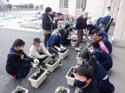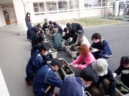 本校からは約40人の生徒の皆さんが集まり、大事に植替えを行いました。放課の短い時間でしたが、さすが中学生の力はすごく、あっという間にプランターが出来上がっていきます。きっと春には、きれいなパンジーが地区の小中学校で咲き誇るでしょう。