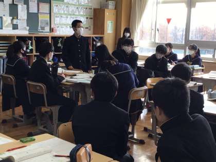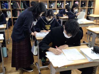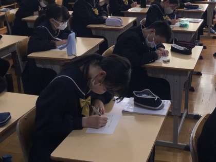 11日(月)、1年生の道徳の授業では、いじめ防止標語を考えていました。県全体で募集しているもので、これまでの道徳の授業で学んだことなどを元に一人一人じっくり考えていました。2年生の国語の授業では、古典の学習を行っていました。登場人物の考えを読み取り、班で話し合ったのちに、学級全体で共有していました。本文をじっくりと読み込んで理解を深めていました。3年生の数学や社会の授業では、今週行われる学習診断テストに向けて、これまでの総復習や過去問の類題にチャレンジしていました。分からないところがあると積極的に先生や仲間に質問する姿も見られ意欲が感じられました。