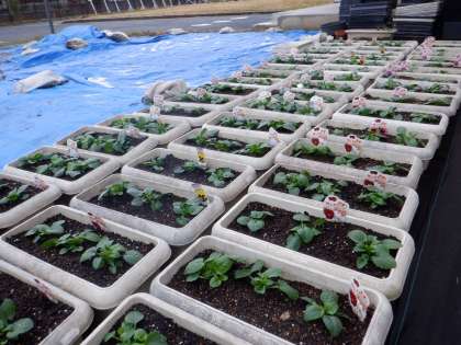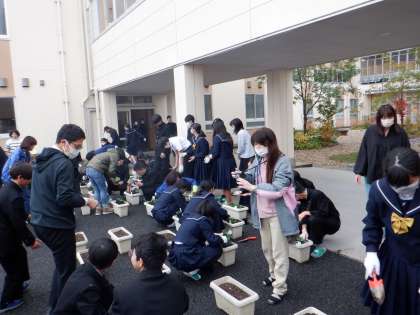 12月12日(火)、本日もパンジーの苗植えを行いました。二日目の今日は、昨日の人数を上回る、約60人の生徒の皆さんが集まって作業をしました。連日の生徒もいたため、手順がとてもスムーズで、すべてのプランターが完成しました。