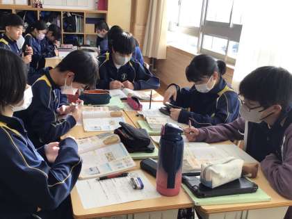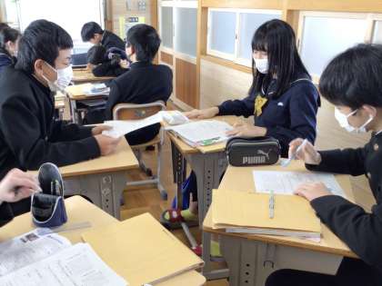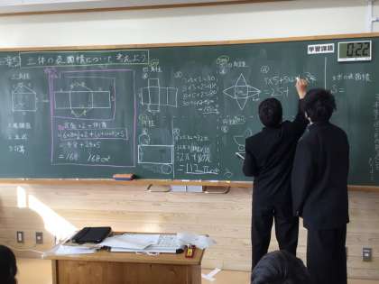 18日(月)、1年生の数学の授業では、図形の学習を行っていました。様々な種類がある立体図形の表面積の求め方を各自がタブレットで考えたことをもとに各班で話し合い、全体の場で確認をしていました。2年生の理科の授業では、電力の学習を行っていました。前時に行った実験結果をもとに、各班で協力してデータを整理し、結果から分かることを話し合っていました。3年生の社会科の授業では、貨幣や金融の学習を行っていました。当たり前に使っているお金の役割や歴史等について、身近な話題や先生の話をもとに、班で話し合い考えを深めていました。社会に出てからも役立つ話し合いでした。