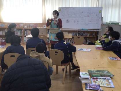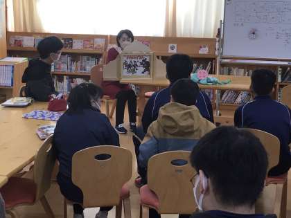 20日(水)午前、図書室でまごころ学級の生徒の皆さんが冬休みに借りる本を選んだ後、学校司書さんのエプロンシアターと紙芝居を見させてもらいました。エプロンシアターはエプロンにお話に登場する建物や風景等が描かれ、布製の登場人物を動かして楽しくお話を進めてくださり、見ていた生徒も声を出して喜ぶなど話に入り込んで楽しんでいました。学校司書さんの上手な語りに教員も引き込まれていました。