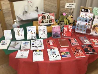 図書室の図書の紹介コーナーはいつも学校司書さんが季節に合わせて様々な図書を紹介してくださっています。今は、年末の風物詩にちなみ、紅白の図書を揃えたその名も「紅白本合戦」。興味深いものばかりなので手に取って見て欲しいと思います。